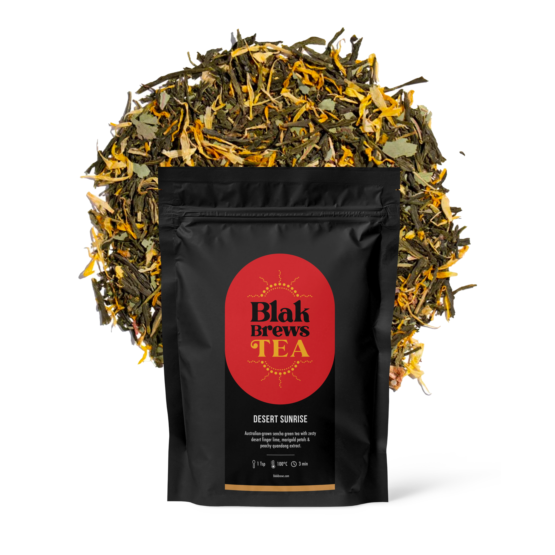 Desert Sunrise - Desert Sunrise tea blends Australian Sencha Green with zesty desert finger lime, marigold petals and peachy Quandong extract to create a fruity and invigorating green tea blend that will brighten up your morning. Provided in bags for your convenience, enjoyed this exceptional tea at any time of the day.