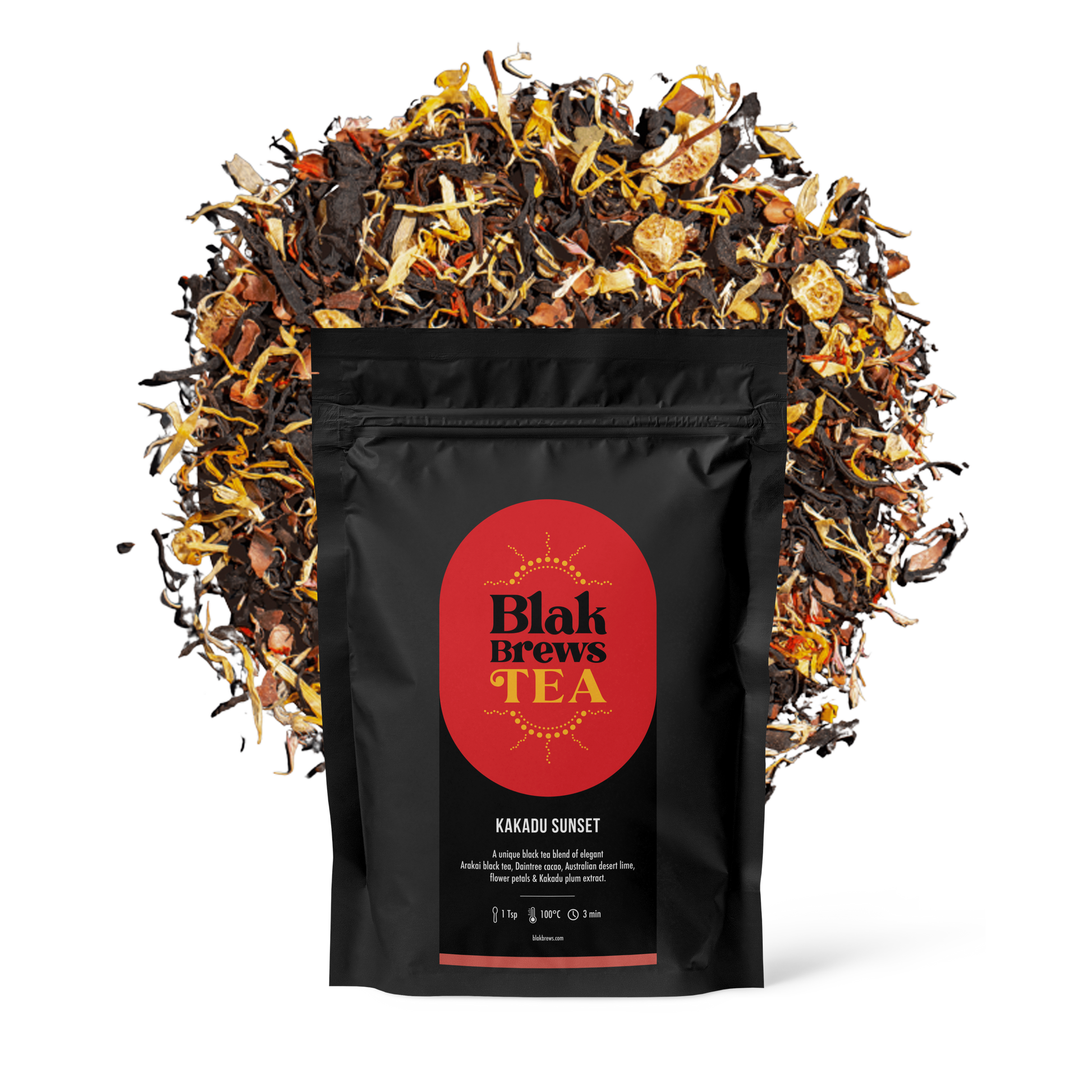 Kakadu Sunset - Kakadu Sunset is a premium Australian-grown black tea from the Arakai estate in Queensland that has been blended with Australian cacao husks, zesty desert finger lime, cornflower, safflower, and calendula with Kakadu Plum extract for a rich and fruity black tea blend.