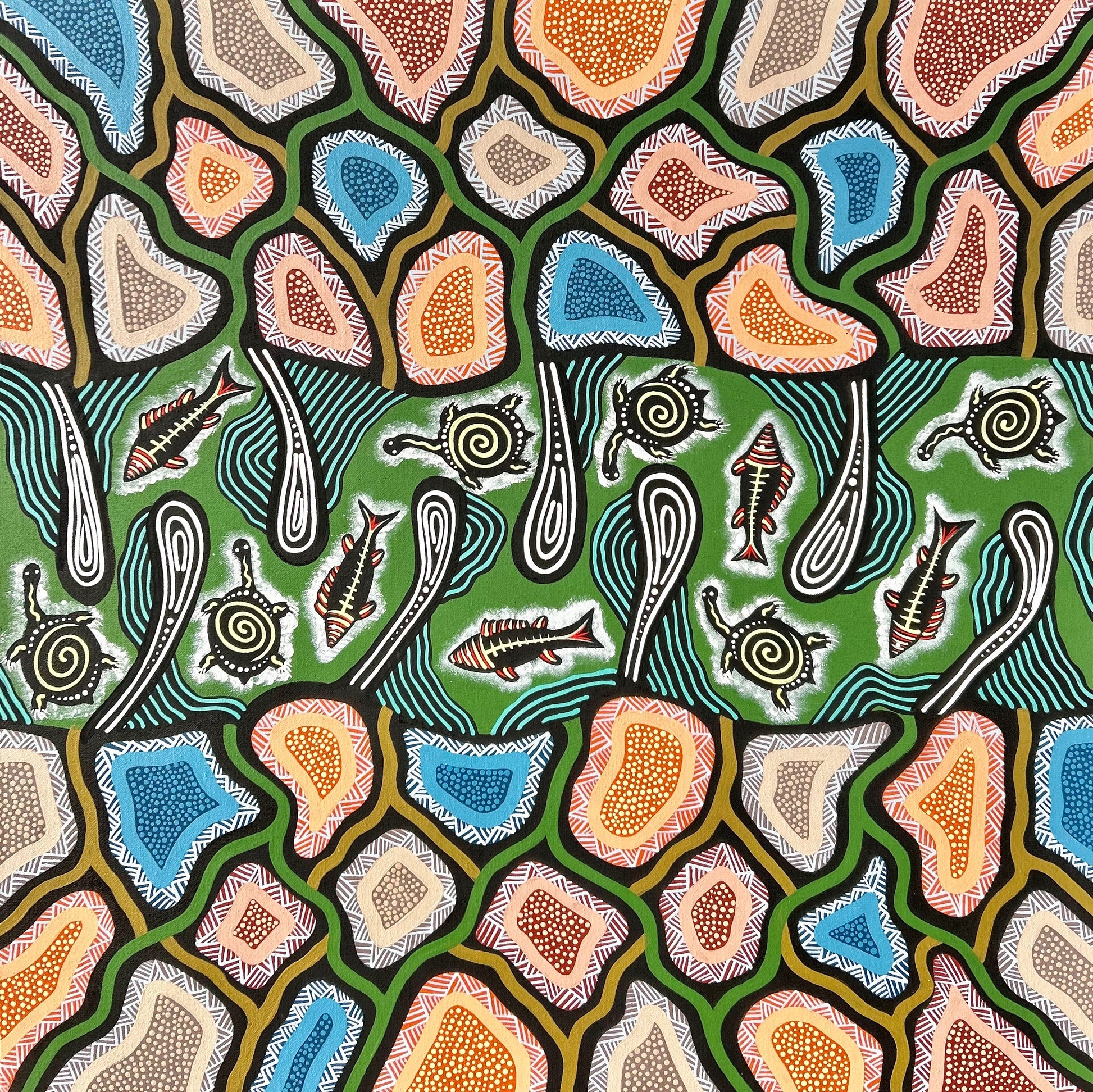 Brett Wilson Art Piece - Gangupka (Perch) Swimming with Long-neck Turtles (101.6cm x 101.6cm)