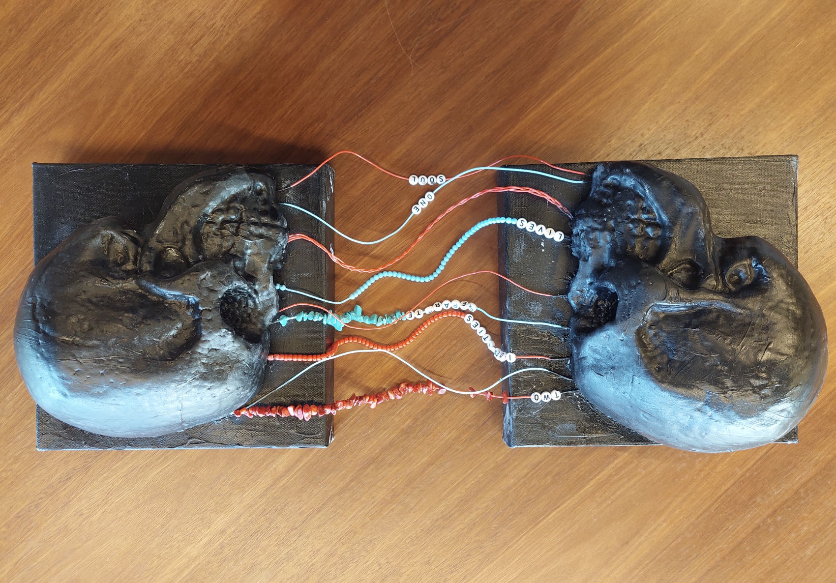 ‘Two Spirits’ is two 8x8 canvases with a foam skull split down the middle and strings connecting the two.