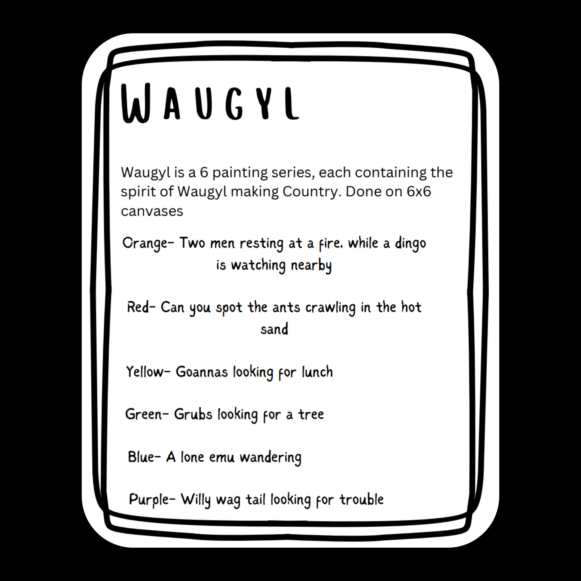 "Waugyl" is a 6 painting series, each containing the spirit of Waugyl making Country. Done on 6x6 canvases