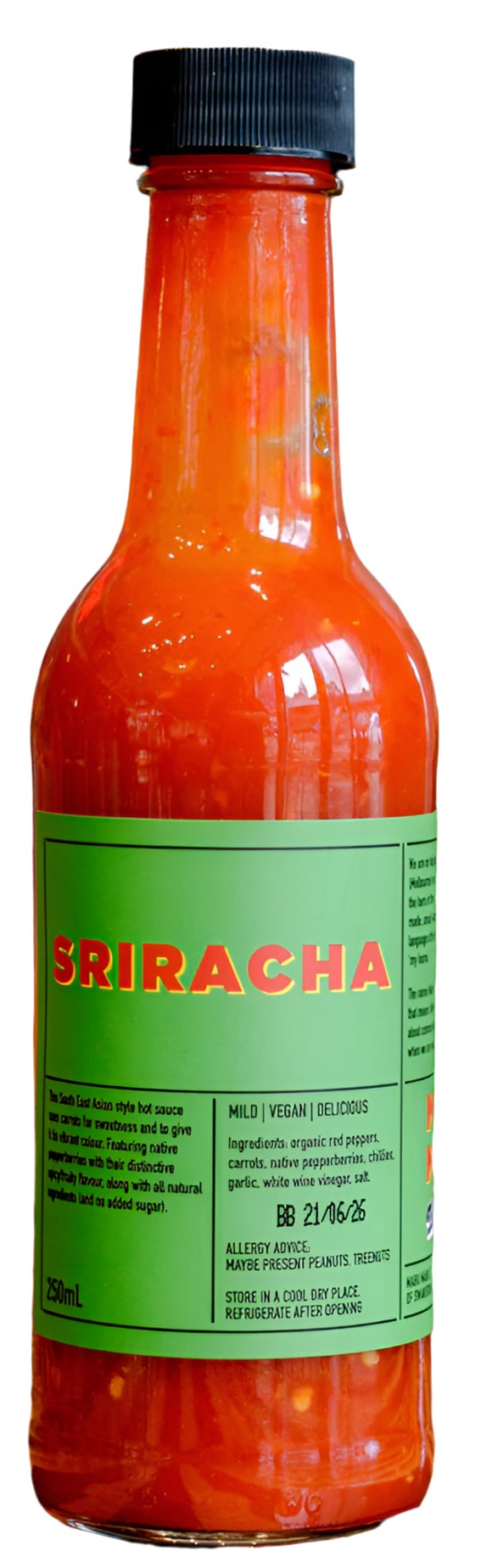 - Sriracha - A south-east Asian style hot sauce with a mild heat. Perfect for those who love to add a dash of chilli to every meal (organic red peppers, carrots, native pepperberries, chillies, garlic, white wine vinegar, salt).