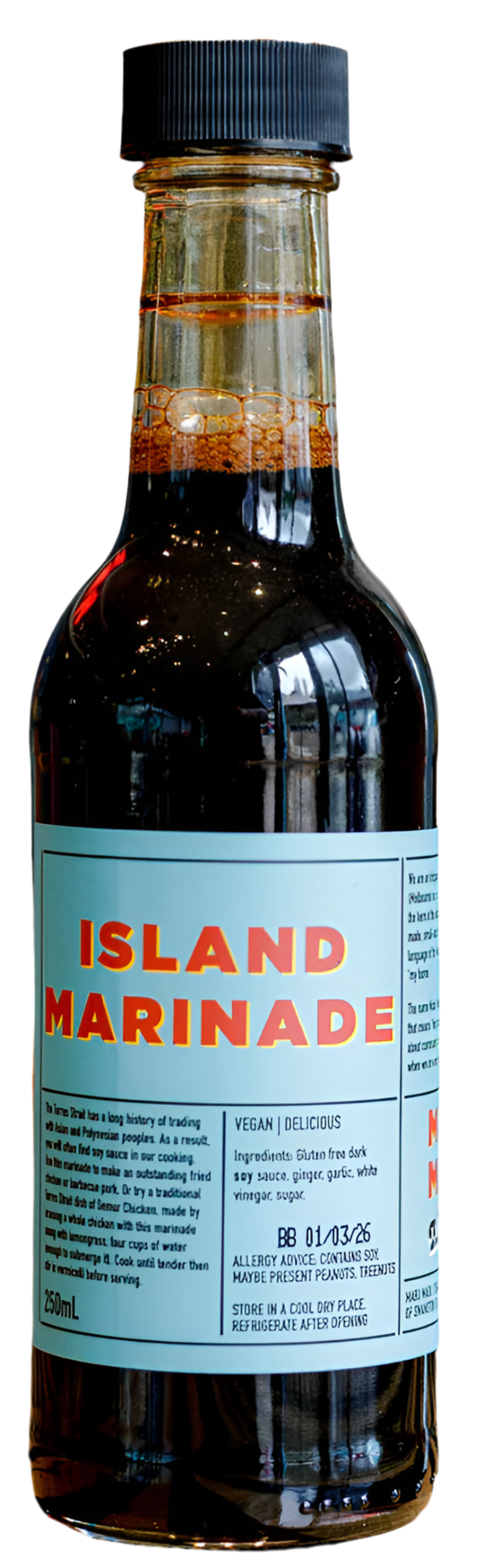 - Island Marinade - The Torres Strait has a long history of trading with Asian and Polynesian peoples. As a result, you will often find soy sauce in our cooking. Use this marinade to make an outstanding fried chicken or barbecue pork (dark soy, ginger, garlic).