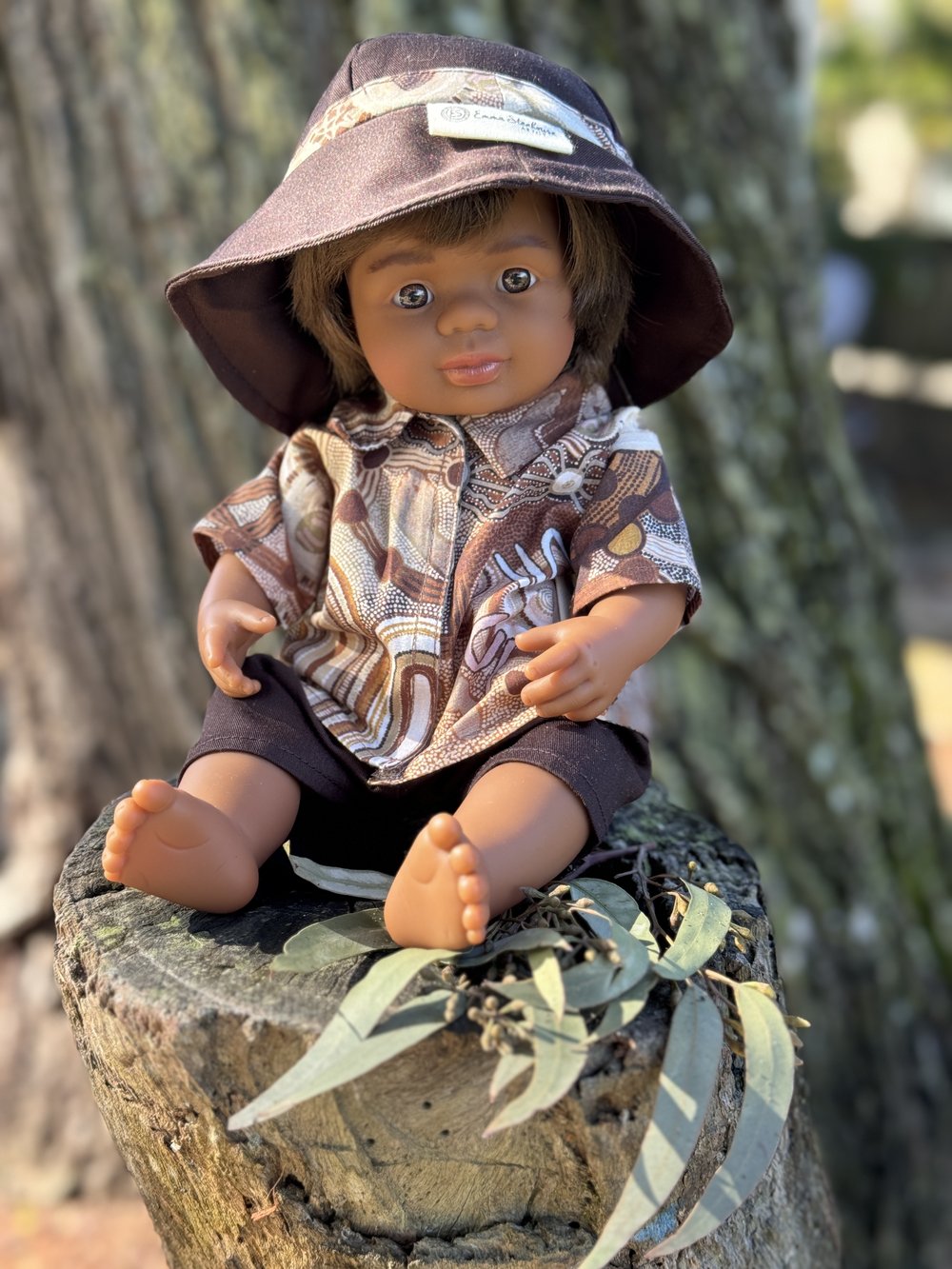 Bundle includes Aboriginal boy doll, one (1) overall and shirt outfit, one (1) shirt and shorts outfit, one (1) bucket hat, one (1) underwear, two (2) coat hangers and one (1) mesh fronted bag