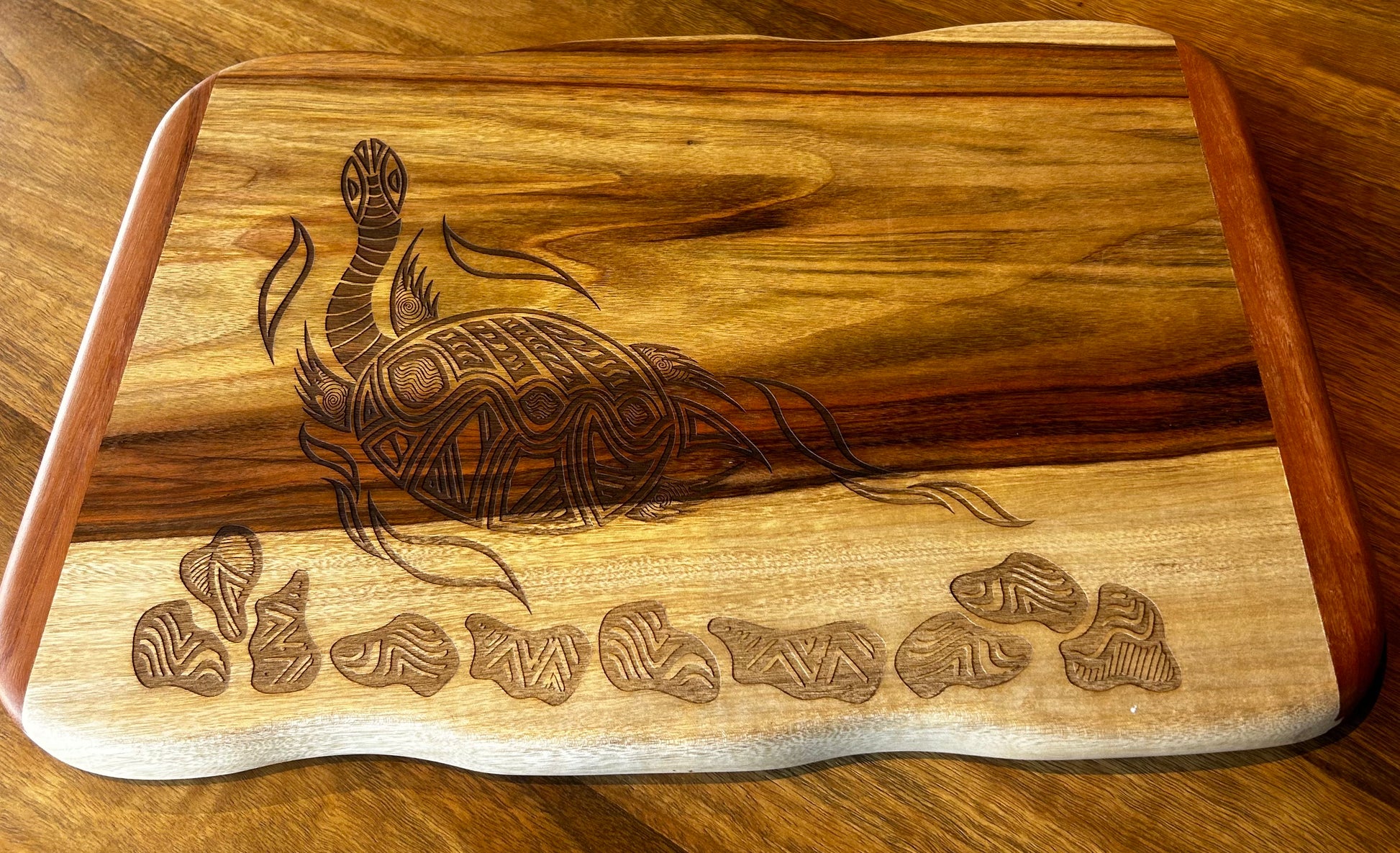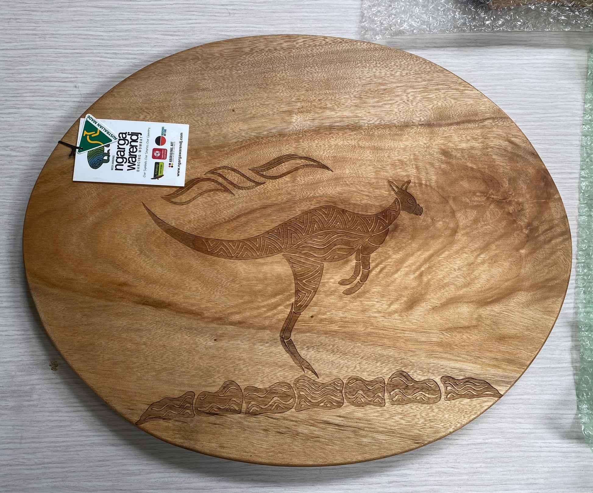 Each chopping block is handcrafted and engraved with a design inspired by the Aboriginal art of South East Australia. Because of their mix of practicality and aesthetics, they can be used for preparing as well as presenting food.